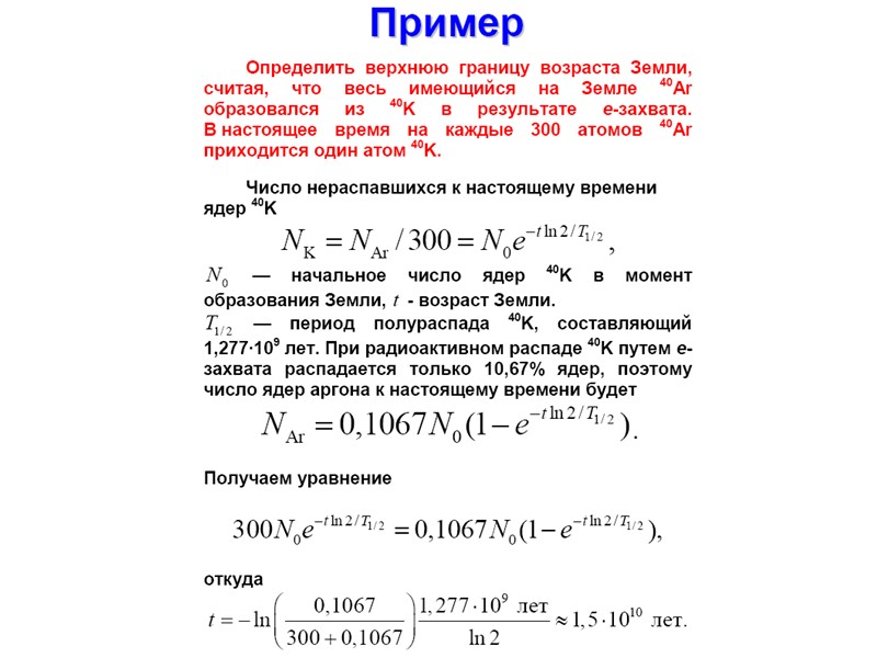 Законы радиоактивного распада ядер Активность A - среднее количество ядер распадающихся в единицу времени Активность измеряется в кюри (Ки) и беккерелях (Бк) 1 Ки = 3.7·1010 распадов/c, 1 Бк = 1 распад/c. Распад исходного ядра 1 в ядро 2, с последующим его распадом в ядро 3, описывается системой дифференциальных уравнений где N1(t) и N2(t) -количество ядер, а 1 и 2 - постоянные распада ядер 1 и 2 соответственно.