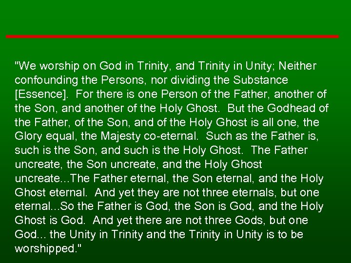 "We worship on God in Trinity, and Trinity in Unity; Neither confounding the Persons, nor dividing the Substance [Essence]. For there is one Person of the Father, another of the Son, and another of the Holy Ghost. But the Godhead of the Father, of the Son, and of the Holy Ghost is all one, the Glory equal, the Majesty co-eternal. Such as the Father is, such is the Son, and such is the Holy Ghost. The Father uncreate, the Son uncreate, and the Holy Ghost uncreate. . . The Father eternal, the Son eternal, and the Holy Ghost eternal. And yet they are not three eternals, but one eternal. . . So the Father is God, the Son is God, and the Holy Ghost is God. And yet there are not three Gods, but one God. . . the Unity in Trinity and the Trinity in Unity is to be worshipped. "