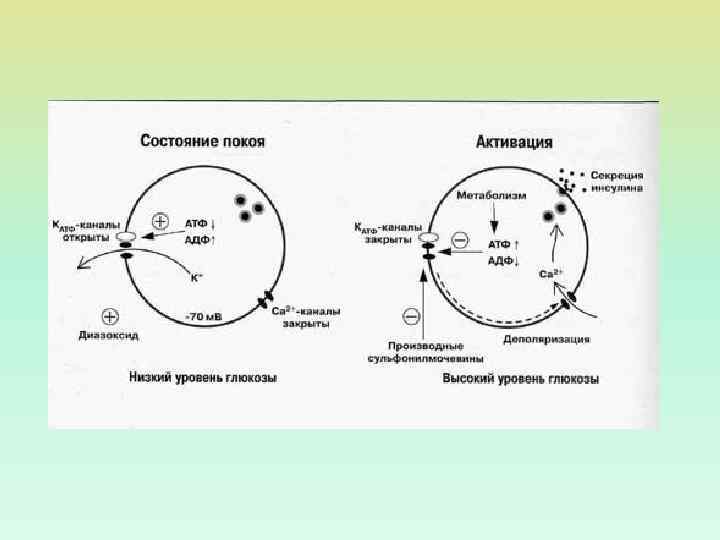 СЕКРЕЦИЯ ИНСУЛИНА: РОЛЬ ИОННЫХ КАНАЛОВ Повышение уровня АТФ Закрывание К-АТФ Деполяризация мембраны 1 — К+-АТФ чувствительный канал; 2 — вольтажзависимый Са 2+-канал; 3 — Са 2+-активируемый К+-канал; ГТ'— ГЛЮТ-2; ГК— глюкокиназа. Открывание Са-каналов, увеличение [Ca 2+]in Индукция экзоцитоза