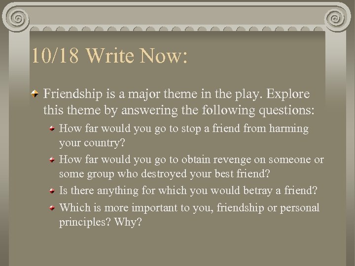 10/18 Write Now: Friendship is a major theme in the play. Explore this theme by answering the following questions: How far would you go to stop a friend from harming your country? How far would you go to obtain revenge on someone or some group who destroyed your best friend? Is there anything for which you would betray a friend? Which is more important to you, friendship or personal principles? Why?