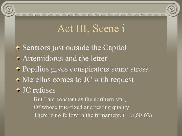Act III, Scene i Senators just outside the Capitol Artemidorus and the letter Popilius gives conspirators some stress Metellus comes to JC with request JC refuses But I am constant as the northern star, Of whose true-fixed and resting quality There is no fellow in the firmament. (III, i, 60 -62)