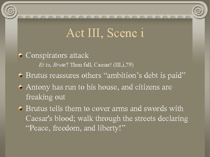 Act III, Scene i Conspirators attack Et tu, Brute? Then fall, Caesar! (III, i, 79) Brutus reassures others “ambition’s debt is paid” Antony has run to his house, and citizens are freaking out Brutus tells them to cover arms and swords with Caesar's blood; walk through the streets declaring “Peace, freedom, and liberty!”