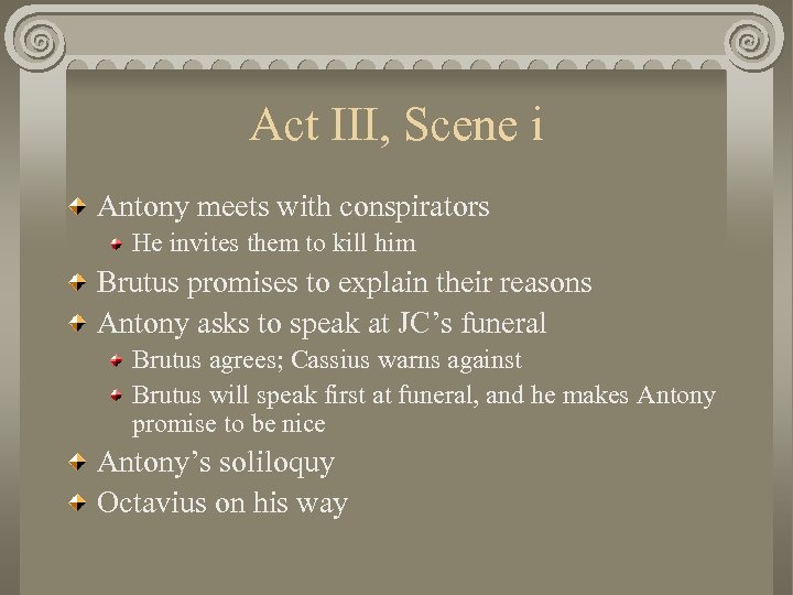 Act III, Scene i Antony meets with conspirators He invites them to kill him Brutus promises to explain their reasons Antony asks to speak at JC’s funeral Brutus agrees; Cassius warns against Brutus will speak first at funeral, and he makes Antony promise to be nice Antony’s soliloquy Octavius on his way