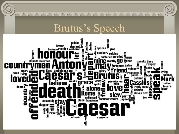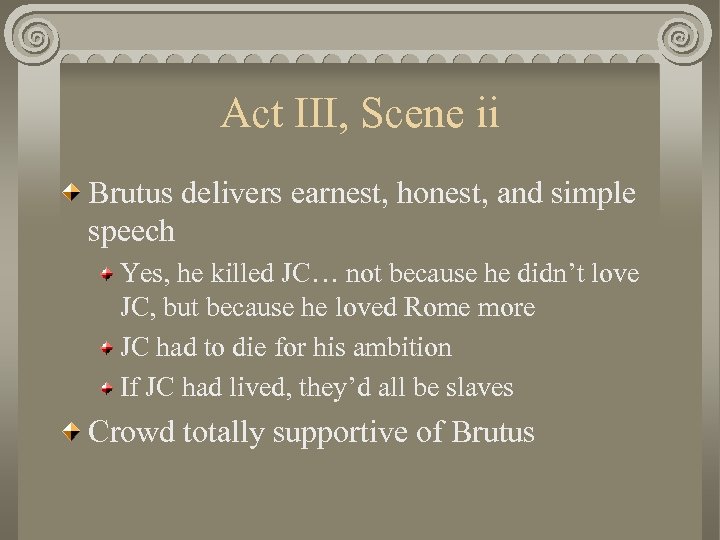 Act III, Scene ii Brutus delivers earnest, honest, and simple speech Yes, he killed JC… not because he didn’t love JC, but because he loved Rome more JC had to die for his ambition If JC had lived, they’d all be slaves Crowd totally supportive of Brutus