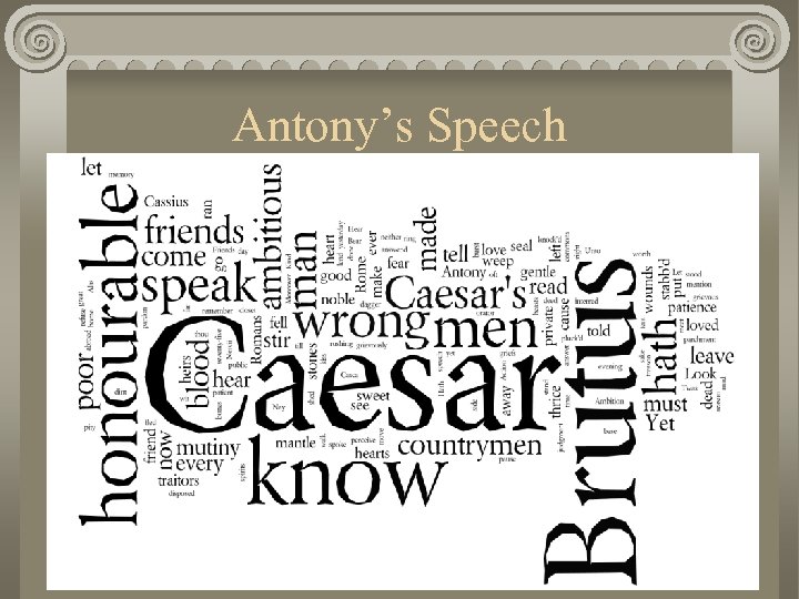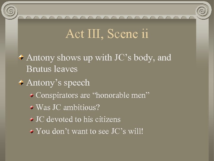 Act III, Scene ii Antony shows up with JC’s body, and Brutus leaves Antony’s speech Conspirators are “honorable men” Was JC ambitious? JC devoted to his citizens You don’t want to see JC’s will!