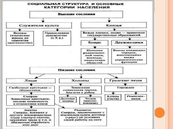 СОЦИАЛЬНАЯ СТРУКТУРА ОБЩЕСТВА. «РУССКАЯ ПРАВДА» . имущество передавалось по наследству сыновьям могли участвовать в вечевых собраниях могли выступать истцами, ответчиками и свидетелями в суде, проводить собственное расследование по имущественным делам являлись собственниками земли, зависимых людей и военных слуг «Русская правда» свободные люди крестьянеобщинники зависимые люди закупы горожане рядовичи высшие слои общества холопы имущество передавалось по наследству сыновьям и дочерям работали на заимодавца, вели свое самостоятельное хозяйство лишены личной свободы на весь срок договора обрабатывали пашню вотчинника, пасли его скот, выполняли строительные и другие работы