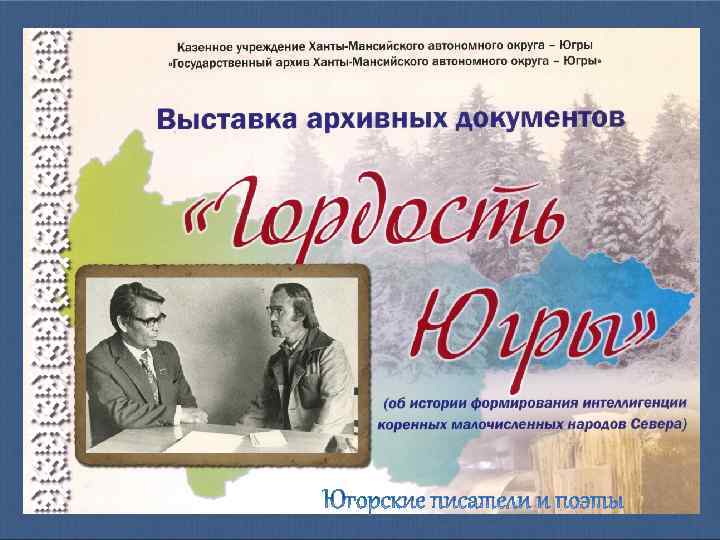 Андрей Семенович Тарханов мансийский поэт Родился в семье охотника - манси в маленькой таежной деревушке Аманья, была такая в Кондинском районе. В 1958 году в окружной газете "Ленинская правда" впервые было опубликовано его стихотворение "Утро". Спустя пять лет вышел первый сборник "Первая завязь". А. С. Тарханов (портрет) 22. 10. 1986 г. ГАХМАО. Фонд Фото. Опись 1. Дело 1313.