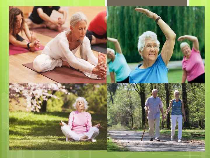 Роль йоги и дыхательной гимнастики в жизни пожилого человека Йога и дыхательная гимнастика не требуют интенсивных физических нагрузок, поэтому считаются безупречным вариантом для пожилых людей. Они поддерживают в нормальном рабочем состоянии опорнодвигательный аппарат и нормализуют работу центральной нервной системы. Их воздействие сказывается на всем организме в целом. Пожилым людям не рекомендуются положения, при которых затрудняется дыхание и появляется ощущения прилива крови к голове, лицу. Также необходимо избегать быстрых движений и силовых упражнений. Обязательно консультироваться с врачом.