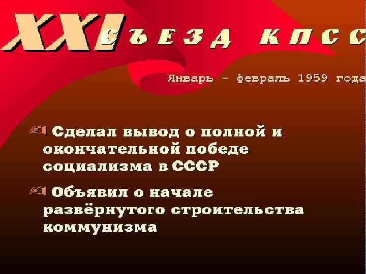 Развенчание культа личности Сталина 1. ХХ съезд стал символом обновления и гуманизма. 2. Появилась возможность для активной общественной жизни. 3. Началось коренное изменение идейной и политической атмосферы (эпоха “оттепели”). 4. Кампания по реабилитации репрессированных существенно расширялась. Посмертно реабилитировали многих деятелей, казненных при Сталине, отменили решения о депортации многих народов в 1941— 1944 гг. , восстановили их национальные автономии. 1. Не затрагивалась суть созданной Сталиным тоталитарной системы. 2. Многие его жестокие действия (коллективизация, беспощадная борьба с внутрипартийной оппозицией) считались оправданными. 3. Хрущев стремился свести проблему к особенностям характера Сталина, а массовые репрессии представить исторической случайностью.