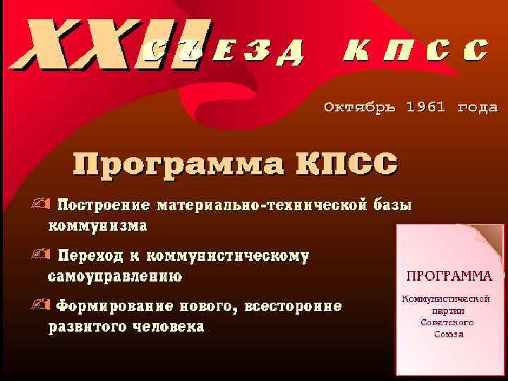 Октябрь 1961 г. - ХХII съезд КПСС. Введение внутрипартийной демократии: 1. Предоставление возможности проведения внутрипартийных дискуссий. 2. Положение о ротации партийных органов в центре и на местах. 3. Расширение прав местных партийных органов. 4. Критерием выдвижения руководящих кадров объявлены лишь их деловые качества.