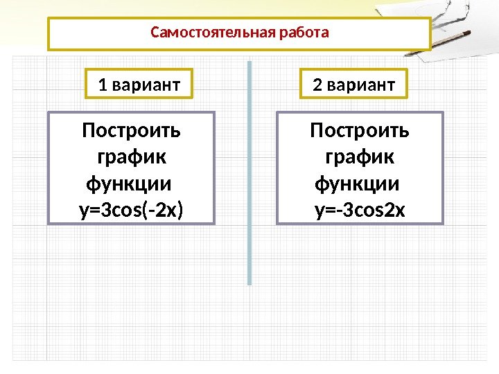 Самостоятельная работа 1 вариант 2 вариант Построить график функции у=3 cos(-2 x) Построить график функции у=-3 cos 2 x