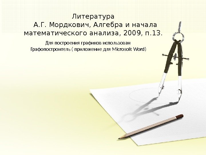 Литература А. Г. Мордкович, Алгебра и начала математического анализа, 2009, п. 13. Для построения графиков использован Графопостроитель ( приложение для Microsoft Word)