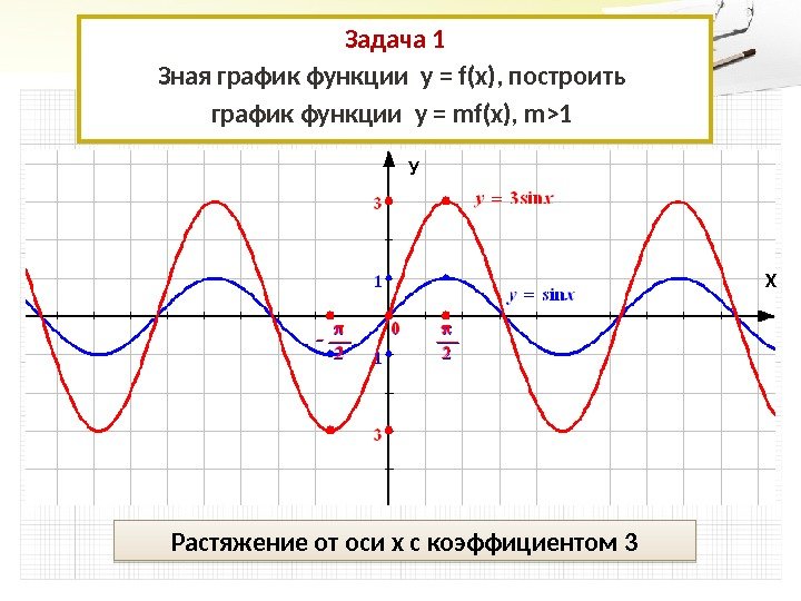 Задача 1 Зная график функции у = f(x), построить график функции у = mf(x), m>1 Растяжение от оси х с коэффициентом 3 ХУ