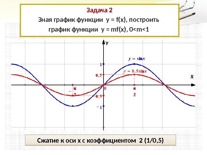 Задача 2 Зная график функции у = f(x), построить график функции у = mf(x), 0<m<1 Сжатие к оси х с коэффициентом 2 (1/0, 5) УХ