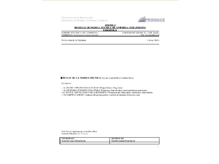 GUÍA PARA LA ELABORACION DE NORMAS TECNICAS DE EMPRESA O PROPIAS (NTE ): Contenido • Estructura de la NTE • Clasificación de las Normas Técnicas de acuerdo a su ámbito de aplicación • Modelo de NTE 44
