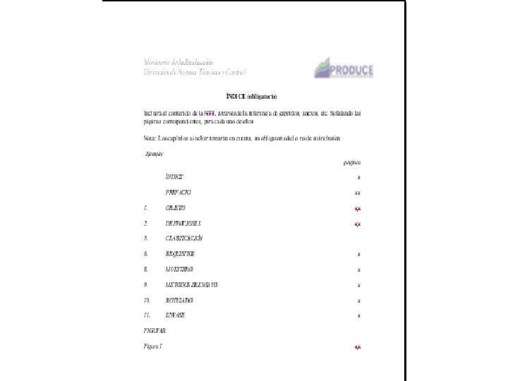 CAPÍTULOS MAS IMPORTANTES (NTE ): Carátula: Título, Ejs: (1) LECHE Y PRODUCTOS LÁCTEOS. Manjarblanco. Requisitos. - (2) PINTURAS Y PRODUCTOS AFINES. Pinturas a base de látex para interiores y exteriores. -(3) TINTAS Y ARTICULOS PARA ESCRITURA. Plumas fuente bolígrafos, plumones, marcadores. - (4) CONFECCIONES. Camisas. Requisitos para camisas de manga larga y/o corta 49