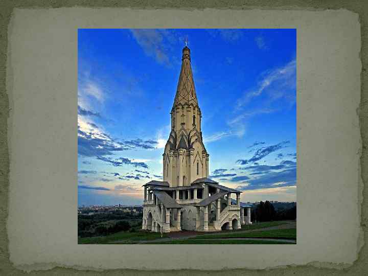 Церковь Вознесения в Коломенском Церковь Вознесения в селе Коломенском была заложена в 1528 году по указу Василия III. Строительство было завершено спустя всего четыре года – в 1532 году. Храм Вознесения стал первым образцом каменно-шатрового зодчества. Скорее всего, церковь строилась под руководством либо псковских архитекторов, либо итальянских. Особенностью церкви Вознесения является то, что в ней отсутствуют внутренние опоры.