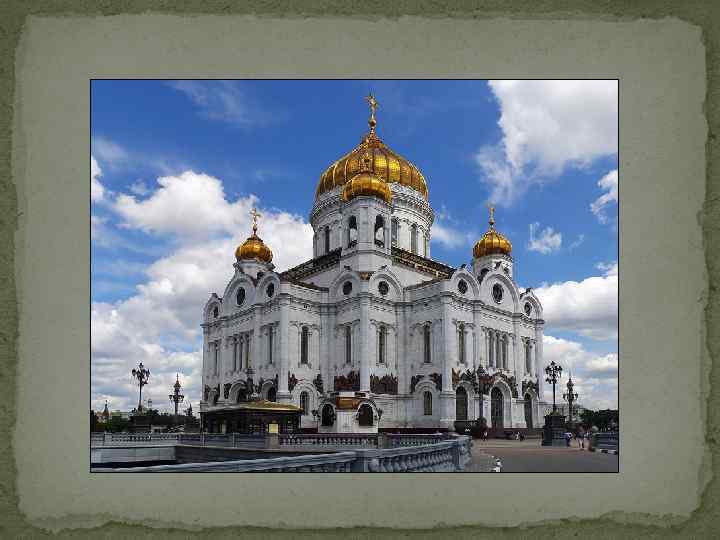 Храм Христа Спасителя был построен в честь победы в Отечественной войне 1812 года. Храм был заложен 12 октября 1817 года в Москве в районе Воробьевых гор. Строительством руководил архитектор А. Л. Витберг. Но из-за затянувшегося строительного процесса и выявленных фактов казнокрадства Витберга сослали на Вятку. Стройка на долгое время была заморожена. 10 апреля 1832 года Николай I одобрил проект К. А. Тона по строительству Храма Христа Спасителя. В 1860 году основные работы по строительству храма были завершены. В последующие 12 лет шла тщательная отделка и роспись собора. 26 мая 1883 года Храм Христа Спасителя был торжественно освящен. К. А. Тон возвел по-настоящему гигантский Храм. Его высота достигает 103 м, а общая площадь составляет 6805 квадратных метров. 5 декабря 1931 года храм Христа Спасителя был взорван коммунистами. Восстановлен храм был лишь в 2000 году. Его торжественное освящение произошло 19 августа 2000 года.