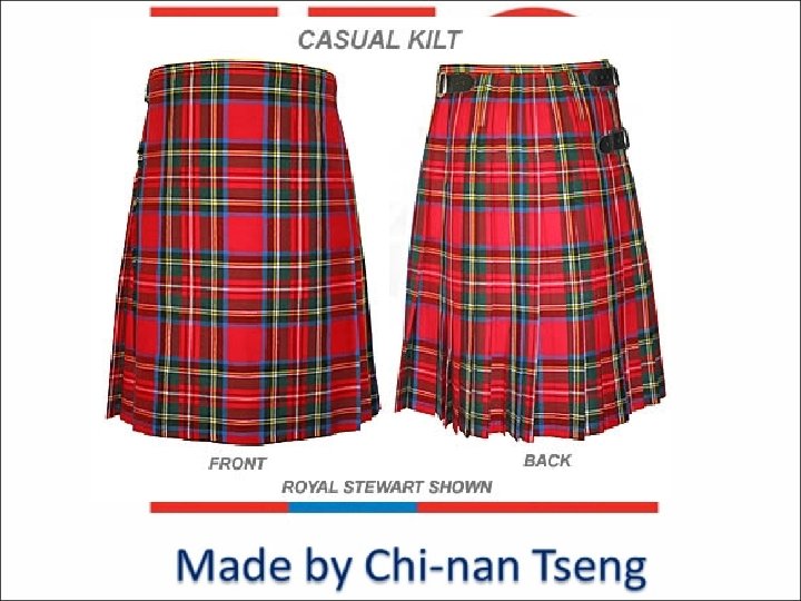 四、閱讀測驗(占 32分) The kilt is a skirt traditionally worn by Scottish men. It is a tailored garment that is wrapped around the wearer’s body at the waist starting from one side, around the front and back and across the front again to the opposite side. The overlapping layers in front are called “aprons. ” Usually, the kilt covers the body from the waist down to just above the knees. A properly made kilt should not be so loose that the wearer can easily twist the kilt around the body, nor should it be so tight that it causes bulging of the fabric where it is buckled. Underwear may be worn as one prefers.