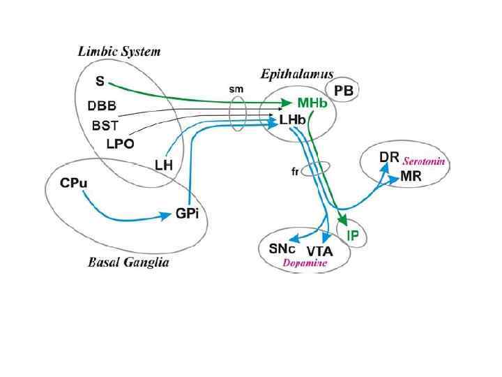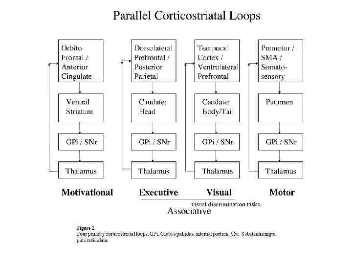 Кора глутамат в стриатуме модульная организация (колона верхней конечности и т. п. ) Полосатое тело ГАМК Бледный шар (внутренний сегмент), Черное вещество (сетчатая часть) Черное вещество (компактная часть) ГАМК Таламус глутамат Бледный шар (наружный сегмент), Субталамическое ядро