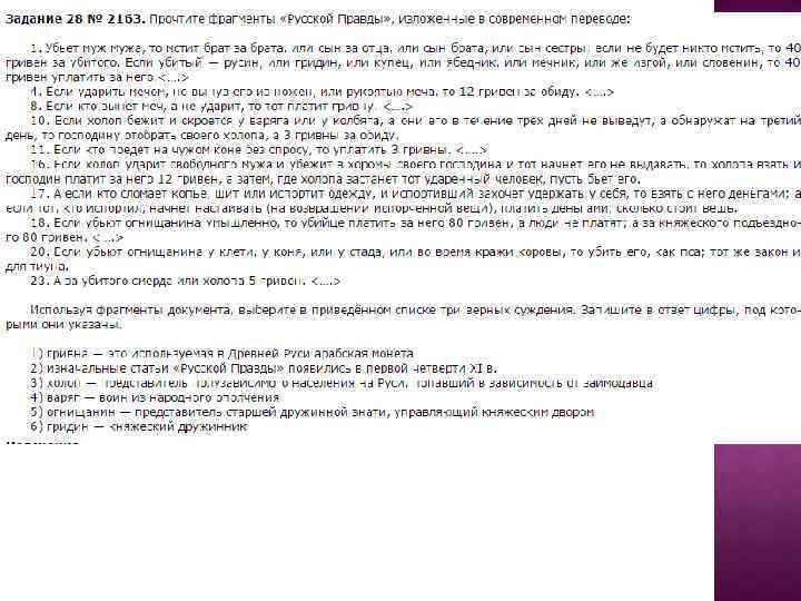 В свод законов «Русская правда» Ярослава Мудрого входили наказания за кражи, убийства, даже различные оскорбления, а также правила ведения суда. Очень важно то, что он отменил смертную казнь! По данному закону можно определить, что в стране начался процесс деления на сословия, появились признаки социального неравенства. Это хорошо видно по системе штрафов, по которой за одно и то же преступление, но в отношении разных в социальном положении лиц, наказание было различным: за убийство огнищанина- вира составляла 80 гривен, а за холопа — 5. Но кровная месть допускалась. За убийство можно было мстить убийце и даже убить его. Вира-штраф за убийство человека.