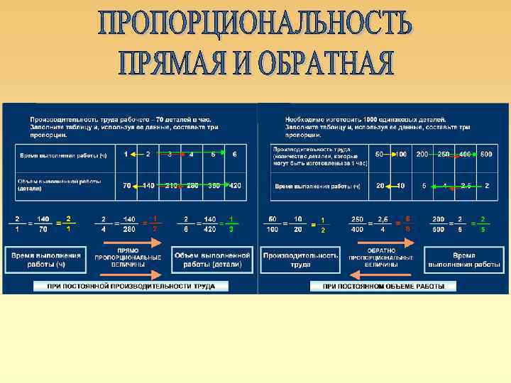 № 1040. Производительность труда рабочего – 70 деталей в час. Заполните таблицу и, используя ее данные, составьте три пропорции. 1 Объем выполненной работы (детали) 2 1 = 140 70 = 2 1 Время выполнения работы (ч) 2 4 = 2 3 4 5 6 70 Время выполнения работы (ч) 140 210 280 350 420 140 280 = 1 2 ПРЯМО ПРОПОРЦИОНАЛЬНЫЕ ВЕЛИЧИНЫ 2 6 = 140 420 = 1 3 Объем выполненной работы (детали) ПРИ ПОСТОЯННОЙ ПРОИЗВОДИТЕЛЬНОСТИ ТРУДА