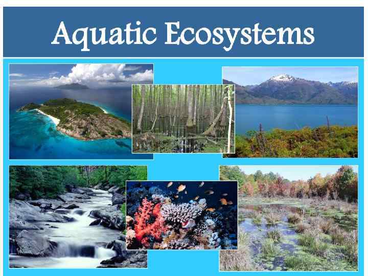 Freshwater ecosystem (rivers, lakes, ponds, streams, lakes, and wetlands) • Biotic Components – Phytoplanktons, zooplanktons, aquatic insects, fishes, reptiles, birds, and detrivores. • Abiotic Components. – temperature, amount of precipitation, geology, soil, sunlight, Water, p. H, and minerals.