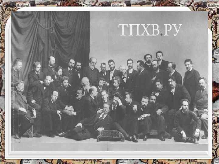 Члены Товарищества передвижников • Фото 1886 г. Стоят: Г. Мясоедов, К. Савицкий, В. Поленов, Е. Волков, В. Суриков, И. Шишкин, Н. Ярошенко, П. Брюллов, А. Беггров; сидят: С. Аммосов, А. Киселев, Н. Неврев, В. Е. Маковский, А. Литовченко, К. Лемох, И. Крамской, И. Репин, П. Ивачев, Н. Е. Маковский.