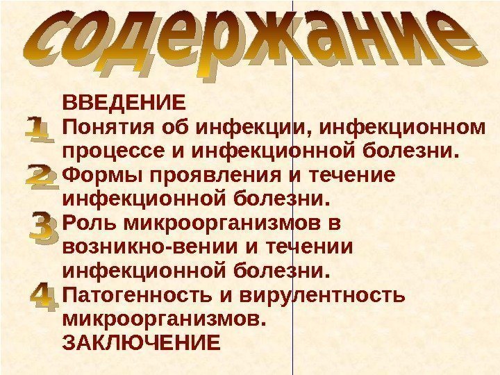 22 ВВЕДЕНИЕ Понятия об инфекции, инфекционном процессе и инфекционной болезни. Формы проявления и течение инфекционной болезни. Роль микроорганизмов в возникно-вении и течении инфекционной болезни. Патогенность и вирулентность микроорганизмов. ЗАКЛЮЧЕНИЕ