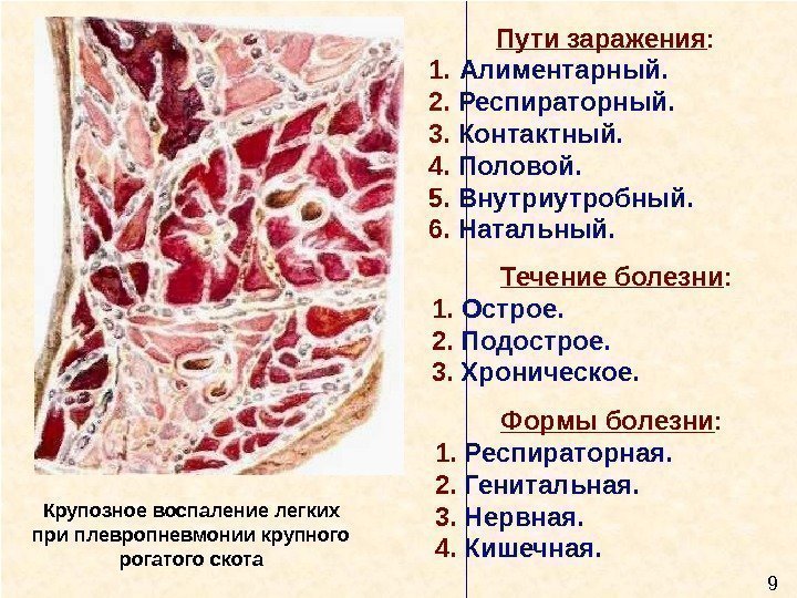 110110 Формы болезни : 1. Респираторная. 2. Генитальная. 3. Нервная. 4. Кишечная. П ут и заражения : 1. А лиментарный. 2. Респираторный. 3. Контактный. 4. Половой. 5. Внутриутробный. 6. Натальный. Течение болезни : 1. Острое. 2. Подострое. 3. Хроническое. 9 Крупозное воспаление легких при плевропневмонии крупного рогатого скота