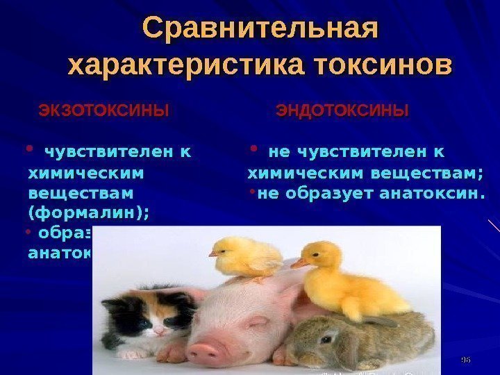 Сравнительная характеристика токсинов ЭКЗОТОКСИНЫ ЭНДОТОКСИНЫ 9595 • действие через 18 -72 ч; • выражен тропизм. • действие через 5 -6 ч. ; • нет тропизма.