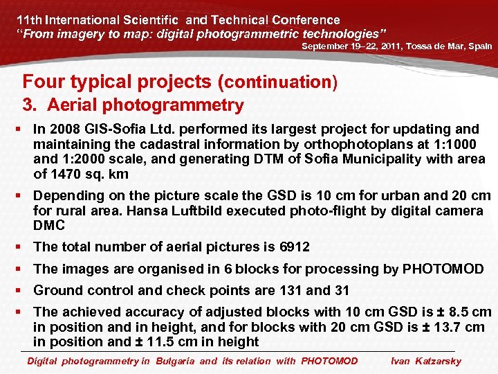 11 th International Scientific and Technical Conference “From imagery to map: digital photogrammetric technologies” September 19– 22, 2011, Tossa de Mar, Spain Four typical projects (continuation) 3. Aerial photogrammetry § In 2008 GIS-Sofia Ltd. performed its largest project for updating and maintaining the cadastral information by orthophotoplans at 1: 1000 and 1: 2000 scale, and generating DTM of Sofia Municipality with area of 1470 sq. km § Depending on the picture scale the GSD is 10 cm for urban and 20 cm for rural area. Hansa Luftbild executed photo-flight by digital camera DMC § The total number of aerial pictures is 6912 § The images are organised in 6 blocks for processing by PHOTOMOD § Ground control and check points are 131 and 31 § The achieved accuracy of adjusted blocks with 10 cm GSD is ± 8. 5 cm in position and in height, and for blocks with 20 cm GSD is ± 13. 7 cm in position and ± 11. 5 cm in height Digital photogrammetry in Bulgaria and its relation with PHOTOMOD Ivan Katzarsky