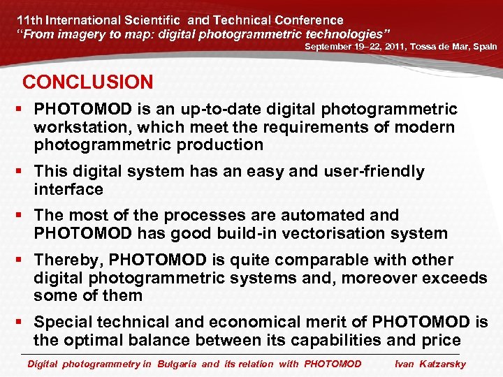 11 th International Scientific and Technical Conference “From imagery to map: digital photogrammetric technologies” September 19– 22, 2011, Tossa de Mar, Spain CONCLUSION § PHOTOMOD is an up-to-date digital photogrammetric workstation, which meet the requirements of modern photogrammetric production § This digital system has an easy and user-friendly interface § The most of the processes are automated and PHOTOMOD has good build-in vectorisation system § Thereby, PHOTOMOD is quite comparable with other digital photogrammetric systems and, moreover exceeds some of them § Special technical and economical merit of PHOTOMOD is the optimal balance between its capabilities and price Digital photogrammetry in Bulgaria and its relation with PHOTOMOD Ivan Katzarsky