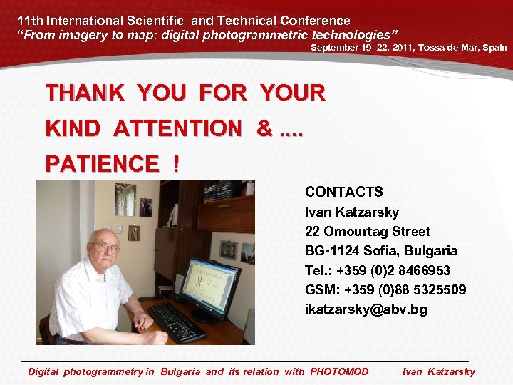 11 th International Scientific and Technical Conference “From imagery to map: digital photogrammetric technologies” September 19– 22, 2011, Tossa de Mar, Spain THANK YOU FOR YOUR KIND ATTENTION &. . PATIENCE ! CONTACTS Ivan Katzarsky 22 Omourtag Street BG-1124 Sofia, Bulgaria Tel. : +359 (0)2 8466953 GSM: +359 (0)88 5325509 ikatzarsky@abv. bg Digital photogrammetry in Bulgaria and its relation with PHOTOMOD Ivan Katzarsky