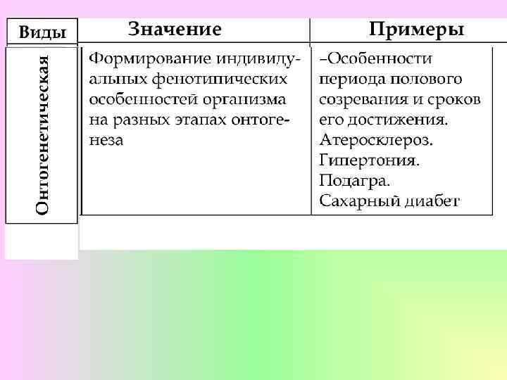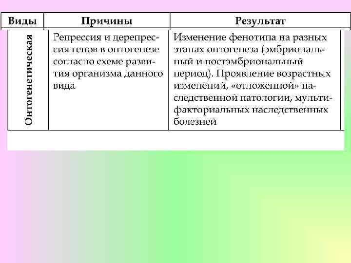 Онтогенетическая изменчивость отражает закономерные изменения в ходе индивидуального развития организма. Причина в функционировании различных наборов генов на разных этапах онтогенеза