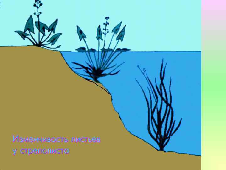Классическим примером модификационной изменчивости является растение стрелолист, которое имеет три вида листьев: листья, растущие под водой- лентовидные, листья, расположенные на воде – овальные, а те, что над водой имеют форму стрелы.