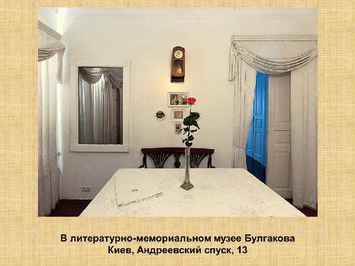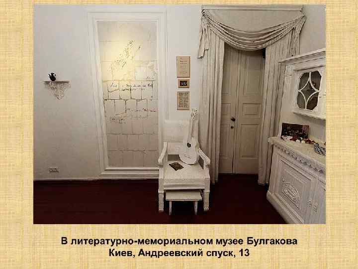Киев, Андреевский спуск, дом 13 В этом доме семья Булгаковых прожила 13 лет, с 1906 по 1919 год. Сейчас здесь располагается литературно-мемориальный музей Булгакова, известный как «Дом Турбиных» : герои романа «Белая гвардия» «жили» именно здесь.