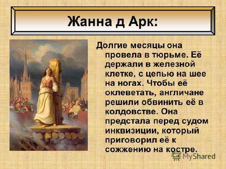 ЗАВЕРШЕНИЕ СТОЛЕТНЕЙ ВОЙНЫ В 1430 году Жанна д’Арк попала в плен. Долгое время она провела в тюрьме. Жанну обвинили в колдовстве и приговорили к сожжению на костре. Король Франции Карл VII, который был многим обязан Жанне д’Арк, не сделал ничего для её спасения. Казнь Жанны д’Арк (Руан, 30 мая 1431 года).