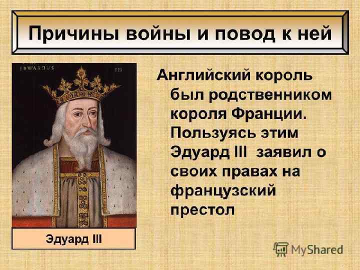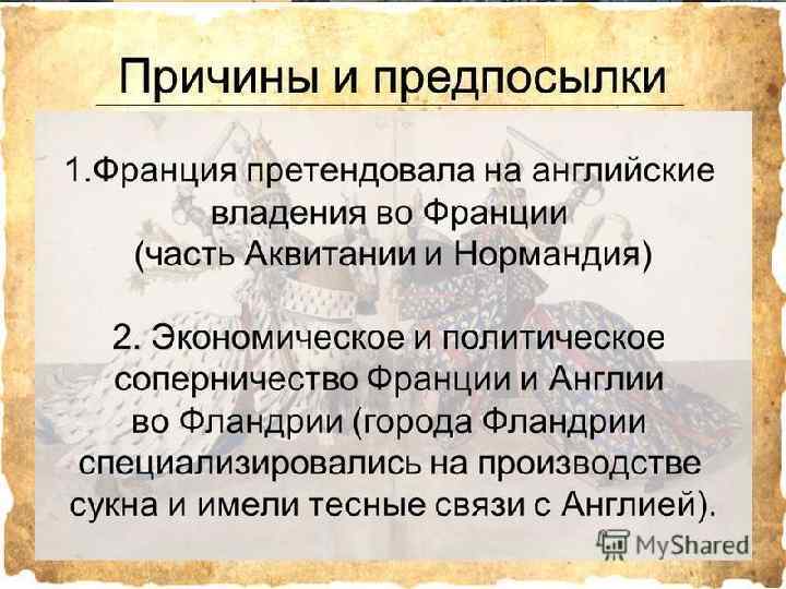 Причины войны • Французский король стремился отвоевать у Англии Аквитанию: без этого не могло завершиться объединение Франции. • Экономическое и политическое соперничество Франции и Англии во Фландрском графстве. Повод к войне Династические спорыанглийский король был родственником короля Франции: его мать была дочерью Филиппа IV Красивого. Используя то, что после смерти сыновей Филиппа IV стала править династия Валуа, он заявил о своих правах на французский престол.
