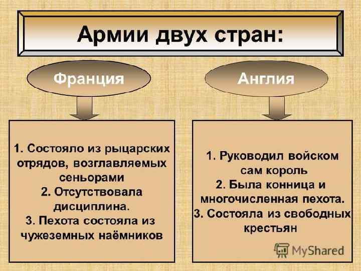 Английская и французская армия В английской армии наемные рыцари четко выполняли приказы командования, умелые лучники и храбрые копейщики из свободных крестьян и горожан тоже привыкли к подчинению и действовал слаженно с конницей. Французское войско состояло из феодального ополчения созванного королем. Доблестью рыцаря считалось его личное мужество, а лучшей защитой – тяжелые доспехи. К наемной пехоте рыцари относились с презрением и не старались помочь в бою.