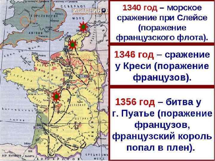 НАЧАЛО И ХОД ВОЙНЫ ДО 1360 ГОДА Ещё одно сокрушительное поражение французы потерпели в битве при Пуатье в 1356 году. В плен к англичанам попали король Франции Иоанн II Добрый и многие знатные феодалы. Вскоре в Кале был заключён мир. Англичане получили во Франции значительные территории на юго-западе страны.