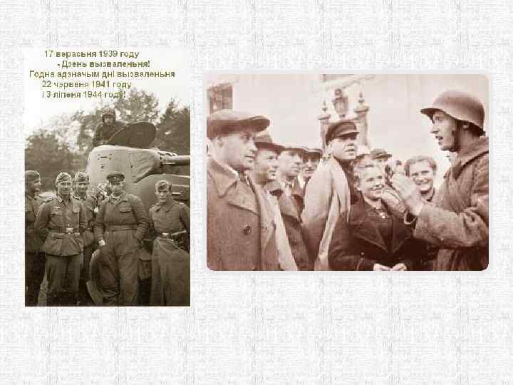 ЭТАПЫ ВОССОЕДИНЕНИЯ ЗАП. БЕЛАРУСИ С БССР 23. 08. 1939 1. 09. 1939 17. 09. 1939 28 -30. 09 1939 14. 11. 1939 Пакт Молотова-Риббентропа о ненападении + секрет. протоколы Начало 2 мировой войны, нападение Германии на Польшу Освободительный поход Красной Армии в Западную Беларусь Договор м/ду Германией и СССР о дружбе и границах Народное собрание в Белостоке Вхождение Зап. Беларуси в состав БССР