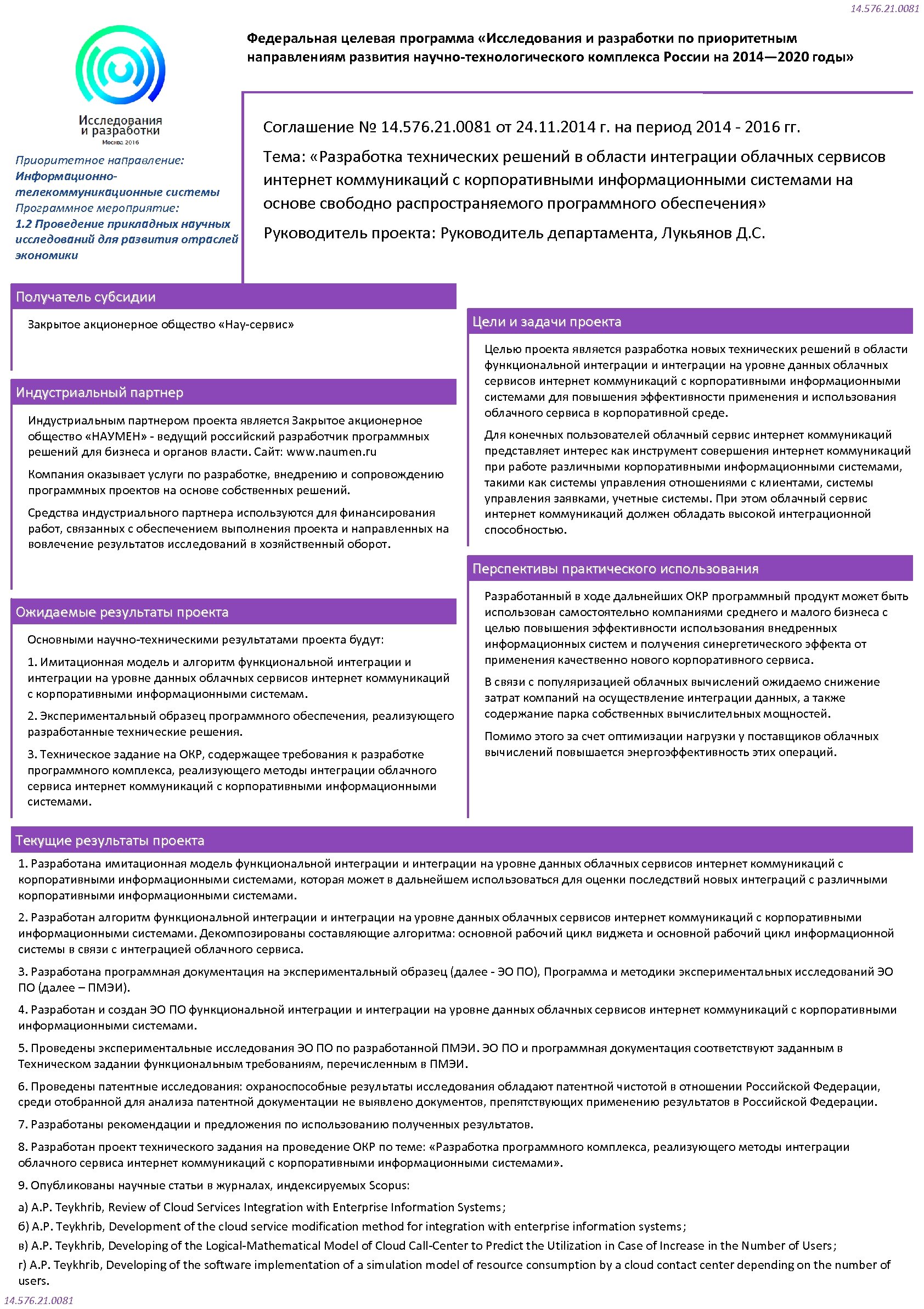 14. 576. 21. 0081 Федеральная целевая программа «Исследования и разработки по приоритетным направлениям развития научно-технологического комплекса России на 2014— 2020 годы» Соглашение № 14. 576. 21. 0081 от 24. 11. 2014 г. на период 2014 - 2016 гг. Приоритетное направление: Информационнотелекоммуникационные системы Программное мероприятие: 1. 2 Проведение прикладных научных исследований для развития отраслей экономики Тема: «Разработка технических решений в области интеграции облачных сервисов интернет коммуникаций с корпоративными информационными системами на основе свободно распространяемого программного обеспечения» Руководитель проекта: Руководитель департамента, Лукьянов Д. С. Получатель субсидии Закрытое акционерное общество «Нау-сервис» Индустриальный партнер Индустриальным партнером проекта является Закрытое акционерное общество «НАУМЕН» - ведущий российский разработчик программных решений для бизнеса и органов власти. Сайт: www. naumen. ru Компания оказывает услуги по разработке, внедрению и сопровождению программных проектов на основе собственных решений. Средства индустриального партнера используются для финансирования работ, связанных с обеспечением выполнения проекта и направленных на вовлечение результатов исследований в хозяйственный оборот. Цели и задачи проекта Целью проекта является разработка новых технических решений в области функциональной интеграции и интеграции на уровне данных облачных сервисов интернет коммуникаций с корпоративными информационными системами для повышения эффективности применения и использования облачного сервиса в корпоративной среде. Для конечных пользователей облачный сервис интернет коммуникаций представляет интерес как инструмент совершения интернет коммуникаций при работе различными корпоративными информационными системами, такими как системы управления отношениями с клиентами, системы управления заявками, учетные системы. При этом облачный сервис интернет коммуникаций должен обладать высокой интеграционной способностью. Перспективы практического использования Ожидаемые результаты проекта Основными научно-техническими результатами проекта будут: 1. Имитационная модель и алгоритм функциональной интеграции и интеграции на уровне данных облачных сервисов интернет коммуникаций с корпоративными информационными системам. 2. Экспериментальный образец программного обеспечения, реализующего разработанные технические решения. 3. Техническое задание на ОКР, содержащее требования к разработке программного комплекса, реализующего методы интеграции облачного сервиса интернет коммуникаций с корпоративными информационными системами. Разработанный в ходе дальнейших ОКР программный продукт может быть использован самостоятельно компаниями среднего и малого бизнеса с целью повышения эффективности использования внедренных информационных систем и получения синергетического эффекта от применения качественно нового корпоративного сервиса. В связи с популяризацией облачных вычислений ожидаемо снижение затрат компаний на осуществление интеграции данных, а также содержание парка собственных вычислительных мощностей. Помимо этого за счет оптимизации нагрузки у поставщиков облачных вычислений повышается энергоэффективность этих операций. Текущие результаты пр