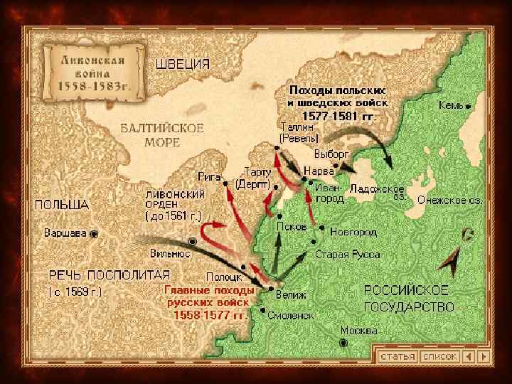 • В мае 1583 года было заключено трёхлетнее Плюсское перемирие со Швецией, по которому в пользу последней уступались Копорье, Ям, Ивангород и прилегающая к ним территория южного побережья Финского залива. Страна была разорена, а северо-западные районы обезлюдели.