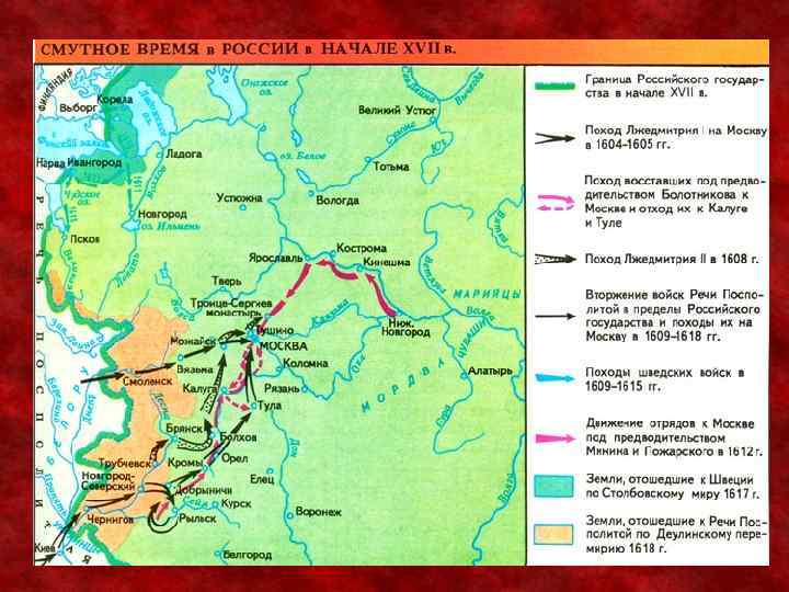 • Правительство Михаила Романова на протяжении 1614— 1617 вело переговоры о прекращении оккупации, однако шведы настаивали на территориальных уступках. Переговоры проходили в обстановке неоднократно возобновлявшихся военных действий и завершились подписанием Столбовского мира 1617 г. Швеция вернула России Новгород, Порхов, Старую Руссу, Ладогу и др. Россия уступала Швеции Ивангород, Ям, Копорье, Орешек, Корелу — то есть весь выход к Балтийскому морю, кроме того, Россия должна была заплатить Швеции 20 тыс. рублей. Границы соблюдались до 1700 г.