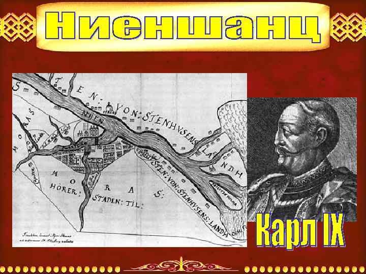 • Осенью 1609 г. шведский король Карл IX послал на Неву доверенного Арвида Тенессона с целью разведки места для строительства новой крепости. Королем было отдано приказание - найти на Неве место удобное для сооружения новой крепости, «чтобы можно было защищать всю Неву под эгидой шведской короны» . • К концу 1611 г. новая крепость, вмещавшая 500 человек, в основном, была завершена. В тех условиях, когда шведский король вынашивал планы закрепления за Швецией Карельской и Ижорской земель, новые укрепления стали важным опорным пунктом, защищавшим устье Невы и проходящие через него коммуникации. • Крепость получила название Нюенсканс, - Невское укрепление. Начиная с петровского времени, в русском языке закрепился немецкий вариант названия крепости - Ниеншанц.