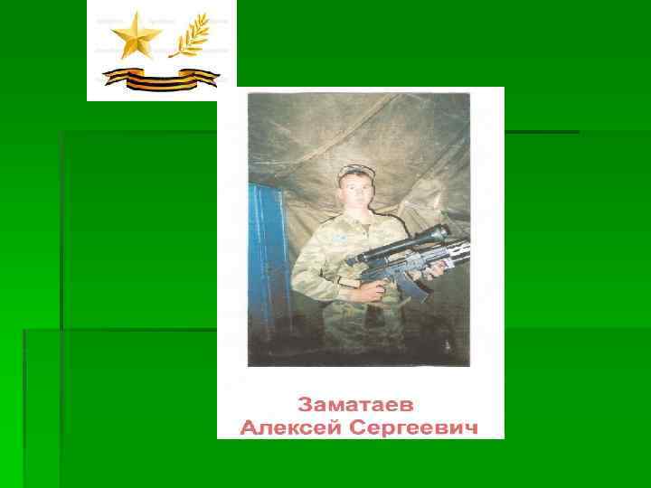 § Заматаев Алексей Сергеевич, старший сержант. § Родился 24 марта 1983 г. в д. Камышево Усть – Таркского района Новосибирской области. В июне 2001 г. призван Татарским ОГВК в Вооружённые Силы РФ. Окончил школу сержантского состава. Службу проходил командиром отделения. § В составе российского батальона, входившего в коллективные миротворческие силы, с мая 2002 г по июнь 2003 г. участвовал в обеспечении нормализации обстановки в зоне грузино – осетинского конфликта в Южной Осетии.