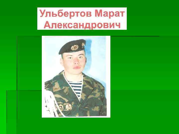 § Ульбертов Марат Александрович, рядовой. § Родился 5 августа 1985 г. в с. Красноярка Татарского района Новосибирской области. В декабре 2003 г. призван Татарским ОГВК во внутренние войска МВД РФ. Службу проходил в частях особого назначения. § В составе сводного подразделения в должности водителя автомобиля с июня 2004 г по ноябрь 2005 г. выполнял служебнобоевые задачи проведении контртеррористических операций в Северо-Кавказском регионе.