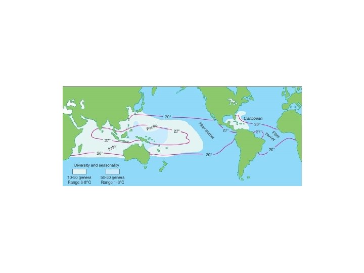 Coral Reef Biogeography • Current division between Pacific and Atlantic provinces • Strong Pacific diversity gradient: (1) diversity drops with increasing longitude, away from center of diversity near Phillipines and Indonesia; (2) also a latitudinal diversity gradient, with diversity dropping with increasing latitude, north and south from near equator • Historically, Pacific and Atlantic provinces were once united by connection across Tethyan Sea, which disappeared in Miocene, ca. 10 million years ago.