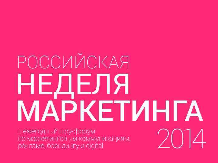 О ШОУ-ФОРУМЕ С 29 мая по 1 июня 2014 года в Москве состоится самый масштабный в России и СНГ шоу-форум по маркетинговым коммуникациям, брендингу и digital – RUSSIAN MARKETING WEEK 2014. 3 дня шоу-форума, 3 потока в параллельных залах, только самые свежие идеи и тренды, качественный контент и полезные связи; лучшие бизнес-тренеры, эксперты и практики. Ключевые партнеры RMWEEK. RU +7 (800) 555 -36 -71 МОСКВА, 23 - 26 апреля